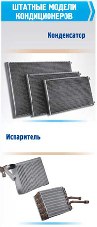 Комплекты разработаны для автомобилей Волга, Лада Калина, Лада Приора, УАЗ Патриот, Шевроле Нива, Фиат Дукато, Максус, Шевроле Ланос, Дэу Ланос. Испаритель кондиционера устанавливается непосредственно в штатный отопитель автомобиля. Применяемые конденсаторы MFC(полнопоточные) с размерами 14*23, 16*26, 18*26 (дюйм). Мощность 3.3 кВт, питание сети 12-24V, воздушный поток более 500 м.куб/час. Применяемые компрессоры - 5Н11, 5Н14. Хладагент - R-134a. В комплектах используются фреоновые магистрали Good Year и Bridgestone производства США, что обеспечивает хорошие показатели герметичности системы.