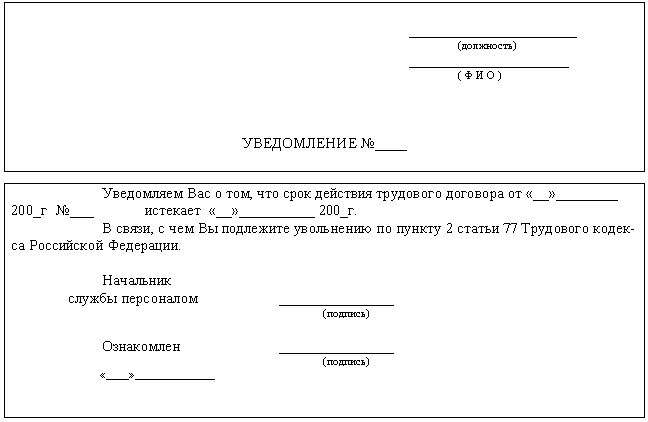 Рис. 77 Образец уведомления об увольнении в связи с окончанием трудового договора